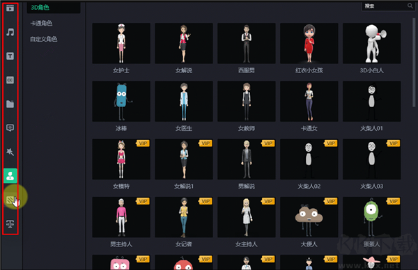 軟件提供豐富的資源組件美化視頻,包括視頻、音頻、文本、字幕、素材庫(kù)、注釋、特效、角色、背景和語音合成