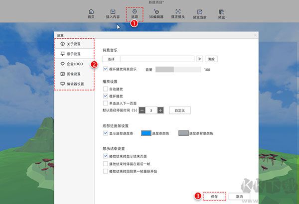 在自定義選項中,可設(shè)置3D演示的背景音樂、標(biāo)志Logo、播放條展示等,支持自定義圖像設(shè)置和編輯器設(shè)置。