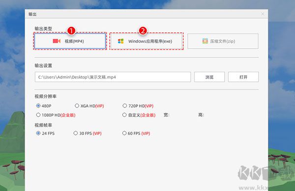 魅演3D目前提供了兩種輸出方式:Windows應(yīng)用程序(exe)和視頻(mp4),模板輸出成壓縮文件(zip)正在研發(fā)中。