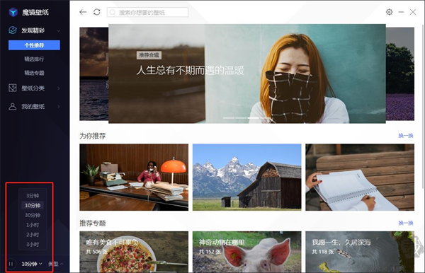 2、此時(shí)會(huì)顯示時(shí)間和類型,切換時(shí)間可更改范圍為:3分鐘、10分鐘、30分鐘、1小時(shí)、2小時(shí)、3小時(shí)。壁紙類型可更改范圍為:我收藏的壁紙、為我推薦。