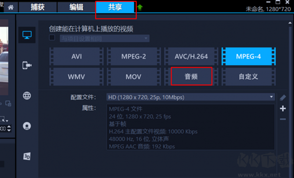 第二步,點(diǎn)擊會(huì)聲會(huì)影的共享面板,在下方的文件格式中,選擇“音頻”格式選項(xiàng)。