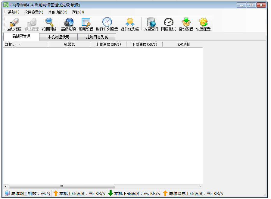 P2P終結(jié)者是一款強大的局域網(wǎng)網(wǎng)速控制軟件,它是局域網(wǎng)管理利器,通過P2P終結(jié)者我們可以監(jiān)控每臺電腦的下載、上傳流量,限制P2P等軟件占用網(wǎng)速,如果你的網(wǎng)速很慢,而且有多臺電腦使用,或許你可以試試P2P終結(jié)者最高權(quán)限版,本站提供最新版本下載。