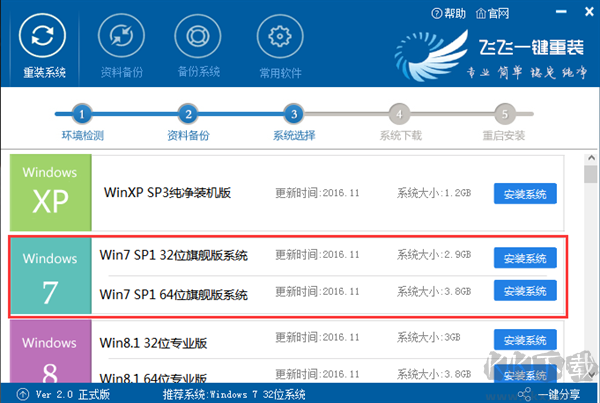 3、到達系統(tǒng)選擇界面,飛飛一鍵重裝精選了好用的操作系統(tǒng),選擇自己需要安裝的操作系統(tǒng)版本、位數(shù),點【安裝系統(tǒng)】;