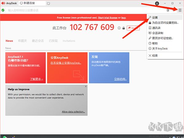 1、打開AnyDesk軟件,點(diǎn)擊右上角“三條橫線”圖標(biāo),選擇“設(shè)置”選項(xiàng),