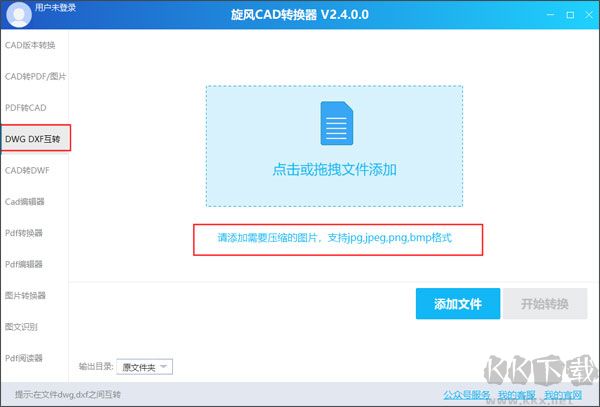 打開軟件之后,用鼠標(biāo)靠近“點擊或拖拽文件添加”,選擇好需要換貨版本的CAD文件。選擇好之后,設(shè)置左下方的輸出類型、輸出版本以及輸出目錄,最后點擊開始轉(zhuǎn)換。