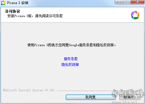 1、下載google picasa軟件包,進(jìn)行解壓縮,雙擊打開。exe安裝程序,進(jìn)入安裝界面,查看許可條款,點(diǎn)擊我同意