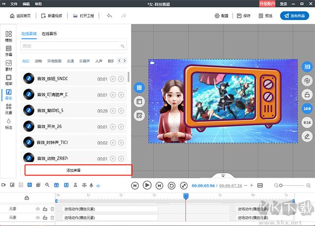 支持導(dǎo)入音頻或現(xiàn)場錄音,雙擊音頻軌道可進(jìn)行剪輯操作,包括截取片段、靜音處理、音頻拆分與合并,并可添加機(jī)器人、變形金剛、消音效果、宇航員、童聲等趣味音效。