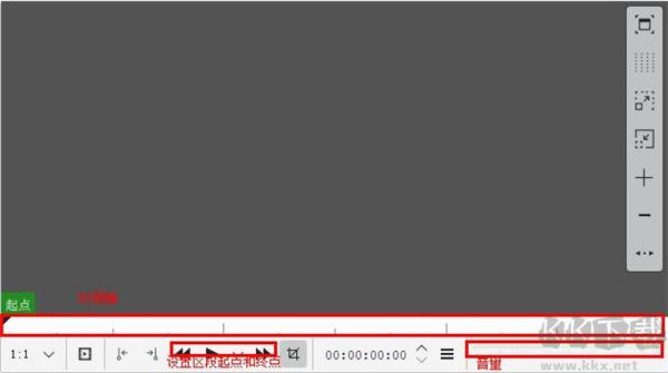 被框出的兩個(gè)按鈕用于設(shè)置預(yù)覽窗口時(shí)間軸上預(yù)覽區(qū)段的起點(diǎn)和終點(diǎn),“播放”按鈕右部的小箭頭下拉框中可以選擇“播放區(qū)段”