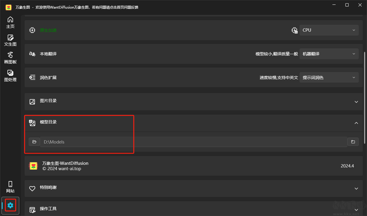 3、下載好模型之后,需要打開軟件并配置模型目錄,首先進入軟件設(shè)置頁,展開模型目錄選項,并選擇模型下載目錄