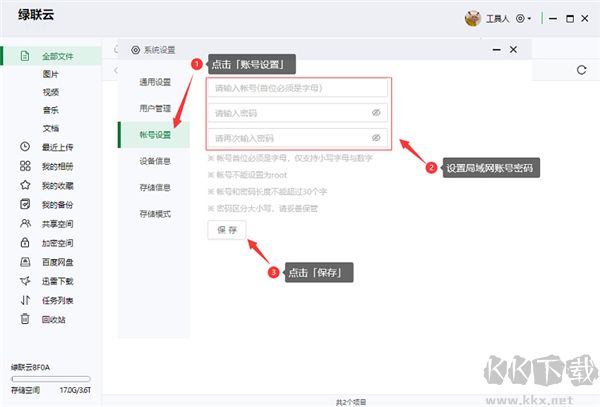① 點(diǎn)擊「賬戶設(shè)置」> ② 設(shè)置局域網(wǎng)賬戶密碼 > ③ 保存;