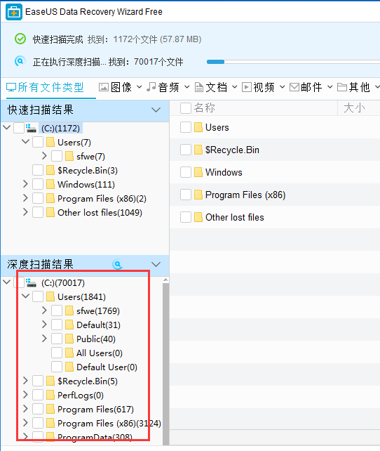 3、在深度掃描結(jié)果的區(qū)域里面可以查看相關(guān)的文件;