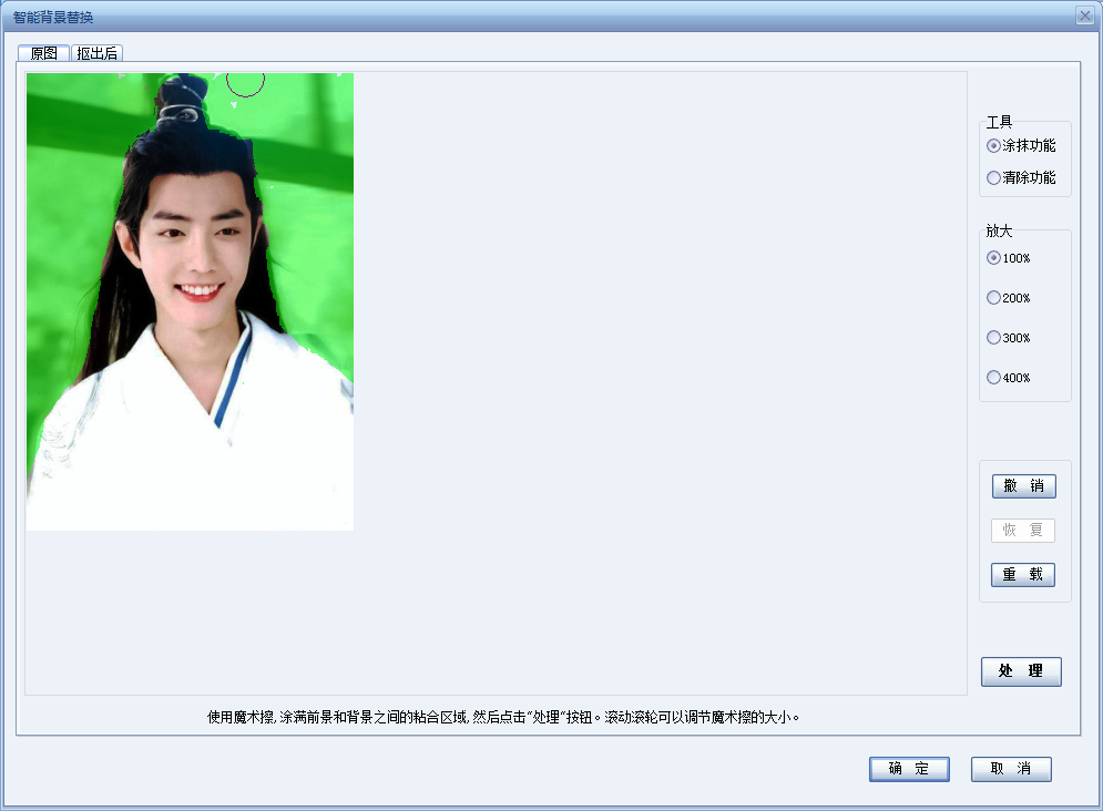 第四步、替換背景。點(diǎn)擊【背景處理】,利用對話框中的涂抹功能和清除功能,替換背景顏色或者背景圖片。