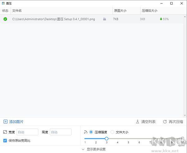 5、軟件下方區(qū)域可以對圖片壓縮后的長寬和壓縮強度、文件大小進行設置。