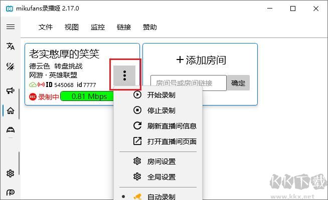 5、房間卡片上的菜單按鍵可控制每個直播間的記錄啟動與停止、調(diào)整自動記錄狀態(tài)、修改房間配置、移除房間等操作。