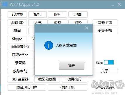 Win10Apps(卸載工具)是一款適用于Windows10系統(tǒng)的應(yīng)用卸載工具,可快速卸載系統(tǒng)自帶的3D建模、相機(jī)、照片、地圖、畫圖 3D、天氣、便簽、財(cái)經(jīng)等不常用軟件,而且不會(huì)影響系統(tǒng)穩(wěn)定性。用戶后續(xù)想重新使用這些軟件,也能通過它重新安裝。主界面會(huì)顯示所有支持卸載與安裝的Windows10預(yù)裝程序(如相機(jī)、人脈等),可以借助它對(duì)系統(tǒng)自帶應(yīng)用實(shí)現(xiàn)一鍵卸載和恢復(fù),輕松完成自帶應(yīng)用的卸載與重裝操作。軟件體積小巧、簡(jiǎn)單易用,只需點(diǎn)擊幾個(gè)按鈕就能正常使用。