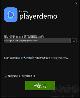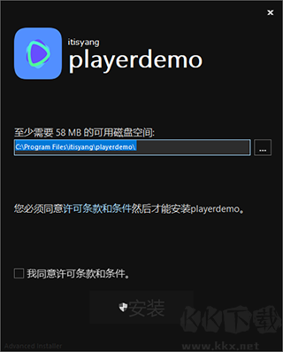 3、選怎安裝目錄,至少需要58MB空間,然后勾選“我同意許可條款和條件”,點擊“安裝”;