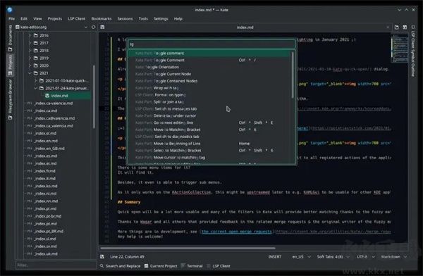 VSCode工作流程的關(guān)鍵組成部分之一是“命令面板”,這可能是VS Code中最常用的功能之一。經(jīng)過漫長的等待,Kate終于實現(xiàn)了這一功能。