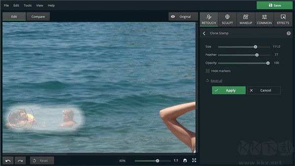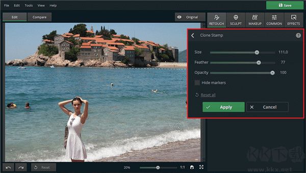 在“修飾”選項卡下,找到“復(fù)制圖章”工具并將其選中。它將幫助您為照片中不需要的人創(chuàng)建無縫的補丁。設(shè)置工具的大小,以使其分散注意力,羽毛設(shè)置使筆刷邊緣更柔和