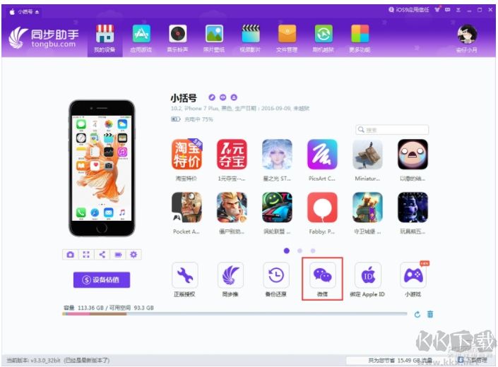 1、把你的手機(jī)連接到電腦,然后打開最新版的同步推蘋果助手,在首頁(yè)里找到【微信】