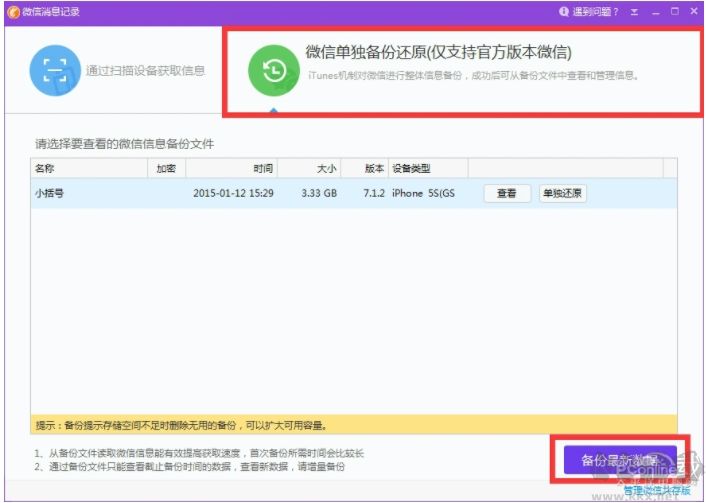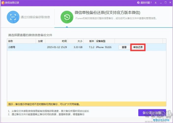 對(duì)準(zhǔn)備好的微信信息備份文件進(jìn)行【單獨(dú)還原】,就可以從備份文件中讀取恢復(fù)之前的微信記錄。