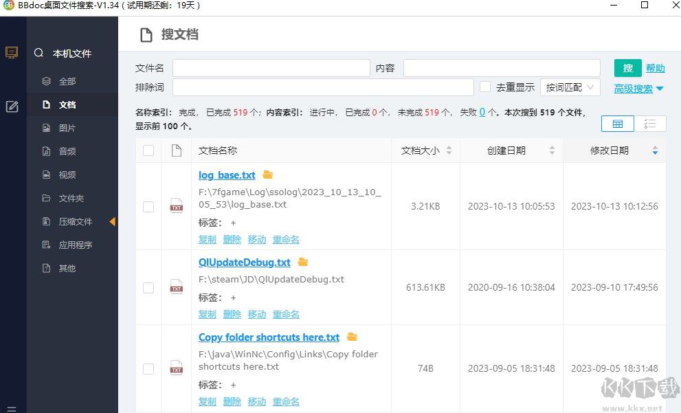 BBdoc(文檔搜索工具)是一款小巧,功能強大的文檔搜索軟件,能對電腦文檔的文件名和內(nèi)容進行搜索,快速找到需要的文檔,搜索速度很快。它操作簡單,設置好文檔類型、大小、名稱和內(nèi)容,就能對電腦里的文檔進行掃描;掃描完成后可直接查看文檔,也能進入文檔目錄。支持文件名、文檔內(nèi)容快速搜索,還能按文件類型、文件修改時間篩選,是日常辦公的好助手。還支持按文檔類型搜索,涵蓋word、pdf、Excel、壓縮文件、csv、wps、txt等;也支持按文件大小搜索,還能按文件大小排序。