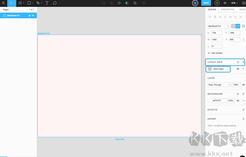 2、但是你也發(fā)現(xiàn)了,空白的界面并不適合設(shè)計(jì),我們需要一些網(wǎng)格來(lái)幫我們輔助定位和分配空間。點(diǎn)擊右邊的加號(hào),能夠看到 LAYOUT GRID 下面的 Grid (10px) 會(huì)幫我們自動(dòng)生成一個(gè)鋪滿當(dāng)前白色頁(yè)面的網(wǎng)格。