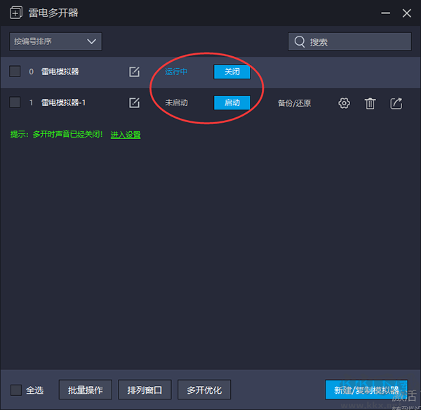 點(diǎn)擊“啟動(dòng)”運(yùn)行對(duì)應(yīng)模擬器,運(yùn)行狀態(tài)下按鈕變?yōu)?ldquo;關(guān)閉”。