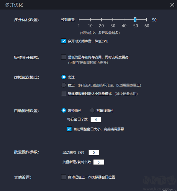 多開(kāi)優(yōu)化:提供幀數(shù)、聲音、虛擬磁盤(pán)等多項(xiàng)設(shè)置,助力流暢多開(kāi)