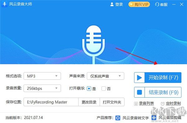 1、啟動應(yīng)用,選好錄制格式與聲音來源,點擊開始錄制。