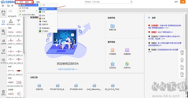 2、點(diǎn)擊界面指定區(qū)域可創(chuàng)建新原理圖、PCB設(shè)計(jì)、Spice符號(hào)等項(xiàng)目