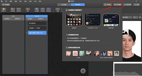 該面板主要用于制作觸發(fā)類效果,例如通過比心動作觸發(fā)妝容顯示。用戶可在此設(shè)置觸發(fā)條件、特效播放時長等參數(shù),增強特效的交互性與趣味性。