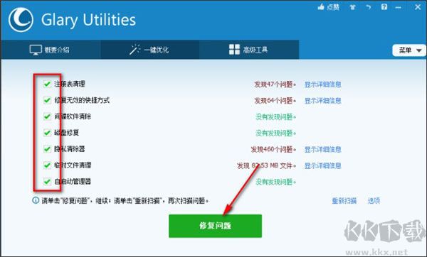 4、勾選待修復(fù)的項目,點擊“修復(fù)問題”開始處理;
