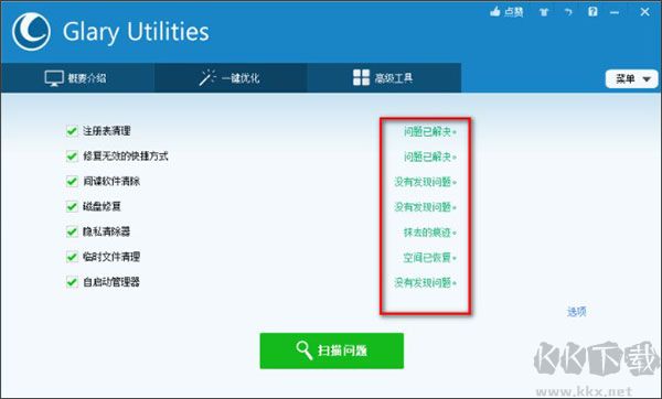 1、在軟件主界面切換到“一鍵優(yōu)化”功能,勾選需要掃描和優(yōu)化的模塊,點擊“掃描問題”按鈕;
