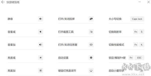 4、提供快捷鍵指南功能,幫助用戶了解筆記本快捷鍵操作(注意:不同機(jī)型功能可能存在差異,卸載軟件后快捷鍵功能可能失效);
