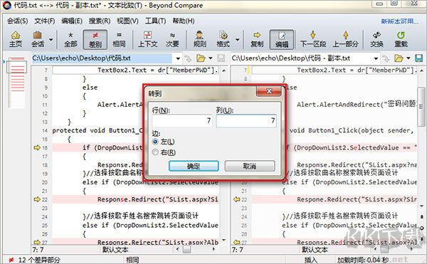 通常在比較代碼文件時(shí),代碼文本內(nèi)容十分的繁雜和冗長,如果想要快速查找某一行的文本內(nèi)容該怎么辦呢?其實(shí)一個(gè)簡單的快捷鍵操作就可以解決這個(gè)問題。使用Ctrl+G快捷鍵后將會(huì)彈出一個(gè)“轉(zhuǎn)到“的窗口頁面,輸入您需要轉(zhuǎn)到的行號(hào)信息,并選擇查找位置,光標(biāo)將會(huì)即刻跳轉(zhuǎn)到相應(yīng)位置。