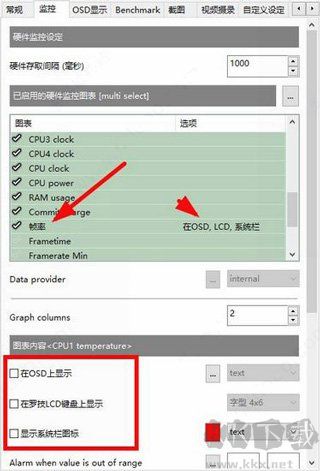 勾選需監(jiān)控的項(xiàng)目,如 GPU 溫度、CPU 使用率、幀率、功耗等。