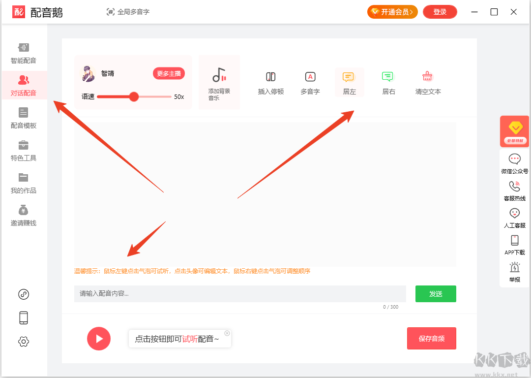2、“對話配音”標(biāo)簽頁支持制作對話類音頻,文本分為左右兩側(cè)便于區(qū)分說話人,每句話可單獨(dú)設(shè)置主播,模擬多人對話,支持調(diào)整順序與試聽;