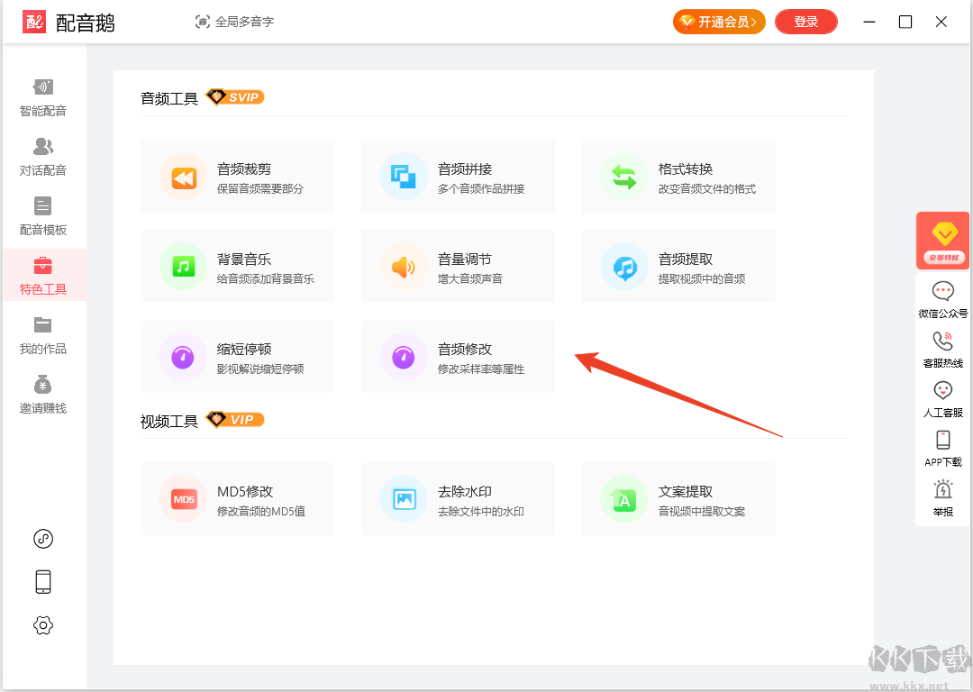 4、“特色工具”提供音頻裁剪、拼接、格式轉(zhuǎn)換及視頻處理等功能,部分高級功能需會員權(quán)限;