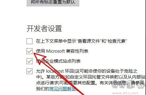 3、進(jìn)入Microsoft Edge瀏覽器設(shè)置頁面,找到“開發(fā)者設(shè)置”選項,在此選項下找到“使用Microsoft兼容性列表”設(shè)置項。
