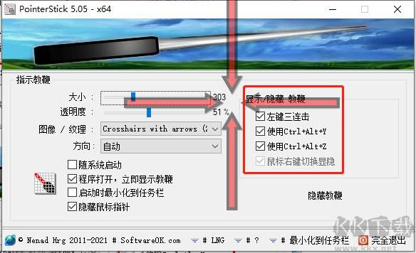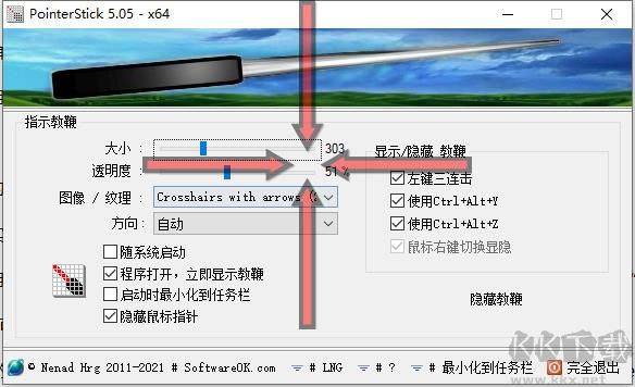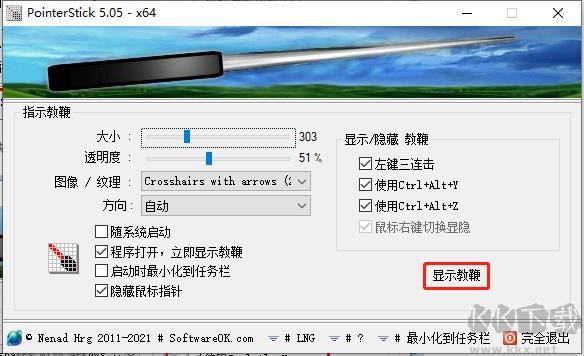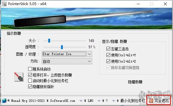 9、提供多種顯示或隱藏指示棒的方法以提升易用性,包括鼠標(biāo)三擊、右鍵點擊系統(tǒng)托盤以及兩個熱鍵(即Ctrl+Alt+Y和Ctrl+Alt+Z)。