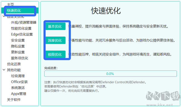 ZyperWin++(系統(tǒng)優(yōu)化)是一款輕便Windows優(yōu)化工具,不需要安裝就可以直接使用,適用于Win7至Win11系統(tǒng)的優(yōu)化操作。軟件提供基本優(yōu)化、深度優(yōu)化、極限優(yōu)化三種優(yōu)化方式,幫助用戶解決電腦卡頓問題,提升電腦性能與運(yùn)行流暢度。可以自主選擇優(yōu)化項(xiàng),比如隱藏Edge邊欄、啟用GPU硬件加速、關(guān)閉廣告ID等,實(shí)現(xiàn)精準(zhǔn)優(yōu)化。軟件還具備Office安裝功能,只需要選定版本、位數(shù)及套件類型,軟件就可以自動(dòng)聯(lián)網(wǎng)完成Office套件的一鍵安裝。需要的朋友快來下載試試吧!