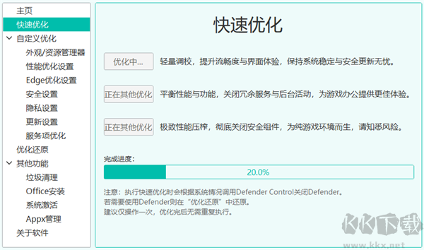 支持手動(dòng)勾選優(yōu)化項(xiàng)目,覆蓋系統(tǒng)性能、后臺服務(wù)、隱私設(shè)置、瀏覽器配置等多個(gè)方面,按需調(diào)整。