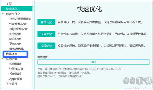 提供恢復(fù)功能,可一鍵撤回優(yōu)化操作,防止誤改設(shè)置導(dǎo)致的系統(tǒng)異常。