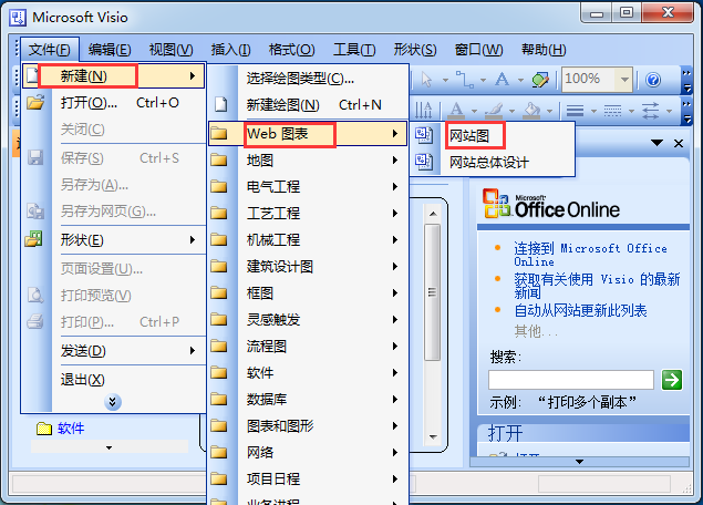 1.打開(kāi)Visio 2003,點(diǎn)擊新建,選擇【新建】——【W(wǎng)eb 圖標(biāo)】——【網(wǎng)站圖】