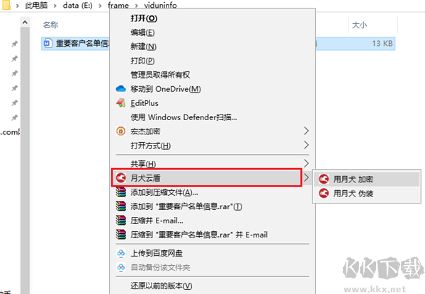 1、鼠標(biāo)右鍵需要加密的word文檔,選擇右鍵菜單“月犬云盾”-“用月犬 加密文件”。
