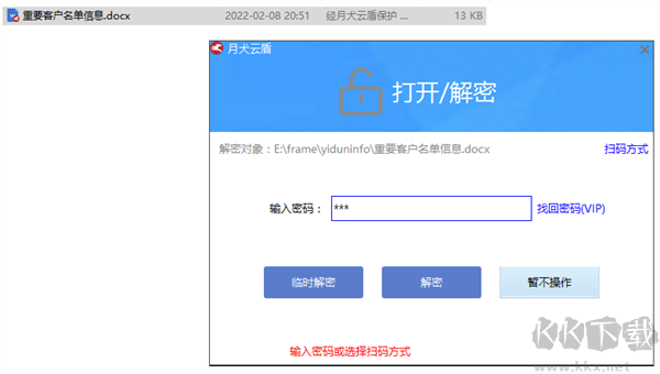 3、文件加密后,需輸入密碼后才能訪問。雙擊加密word文檔,會(huì)彈出以下輸入密碼的對(duì)話框,輸入密碼,點(diǎn)解密,或者臨時(shí)解密。如果點(diǎn)臨時(shí)解密,word文檔使用完后會(huì)自動(dòng)恢復(fù)加密。