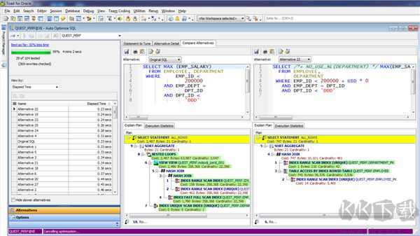 利用 Spotlight 數(shù)據(jù)庫(kù)診斷工具精準(zhǔn)識(shí)別性能瓶頸,快速響應(yīng)問(wèn)題;支持對(duì) SQL、PL/SQL 語(yǔ)句及索引進(jìn)行驗(yàn)證,并通過(guò)專(zhuān)屬的自動(dòng)優(yōu)化套件 SQL Optimizer 實(shí)現(xiàn)高效能查詢(xún)調(diào)校。
