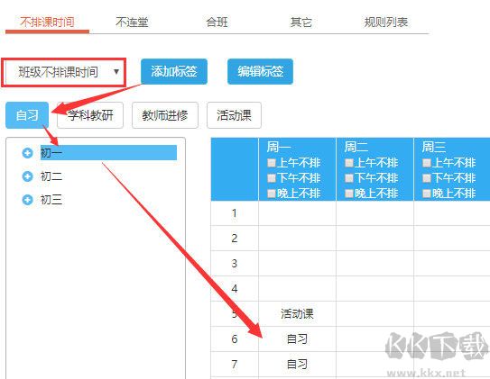 如果需要設(shè)置早晚自習(xí),可以將早晚自習(xí)在基礎(chǔ)信息里和正課進(jìn)行區(qū)分,并為早晚自習(xí)設(shè)置不排課時(shí)間(用來限制早晚自習(xí)的排課節(jié)次)。
