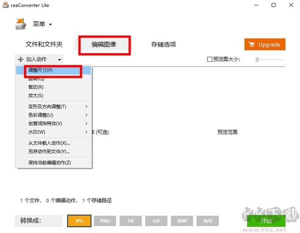 3、點(diǎn)擊確定按鈕之后我們切換到這個編輯圖片的功能中,然后點(diǎn)擊添加動作按鈕,在出現(xiàn)的選項中選擇這個修改尺寸選項。