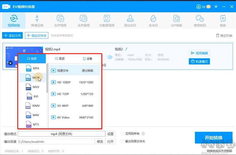 EV視頻轉換器是一款高效實用的視頻處理工具,能夠通過簡單操作完成各類視頻媒體文件的格式轉換,便于在不同設備上播放,軟件集成了格式轉換、視頻壓縮、合并拆分、添加水印等多種常用功能,全面滿足日常視頻編輯需求。